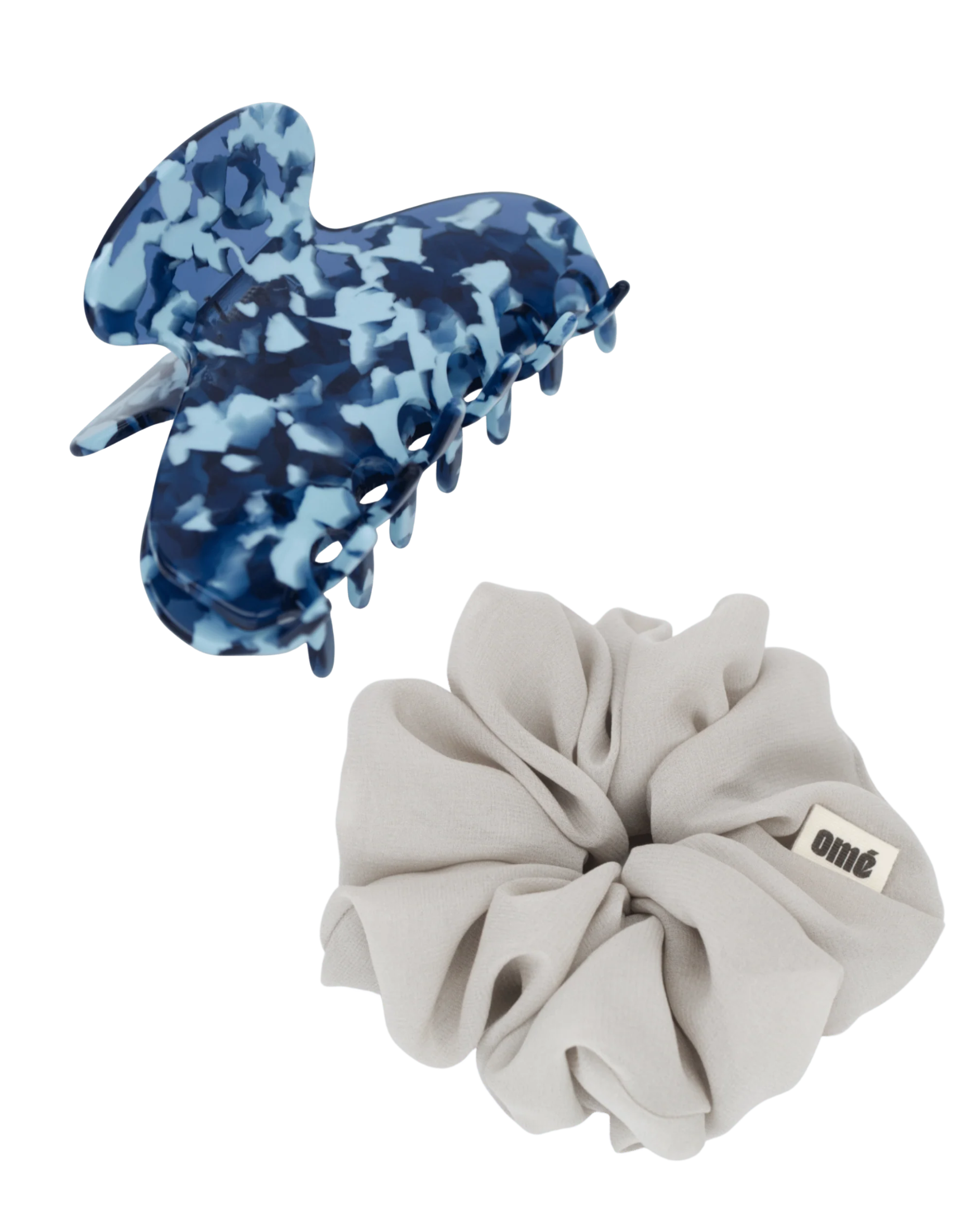 Le chouchou gris en soie confectionné en Suisse à partir d’un tissu de fin de série d’une maison de haute couture, accompagné de la pince opale façonnée à la main en France.