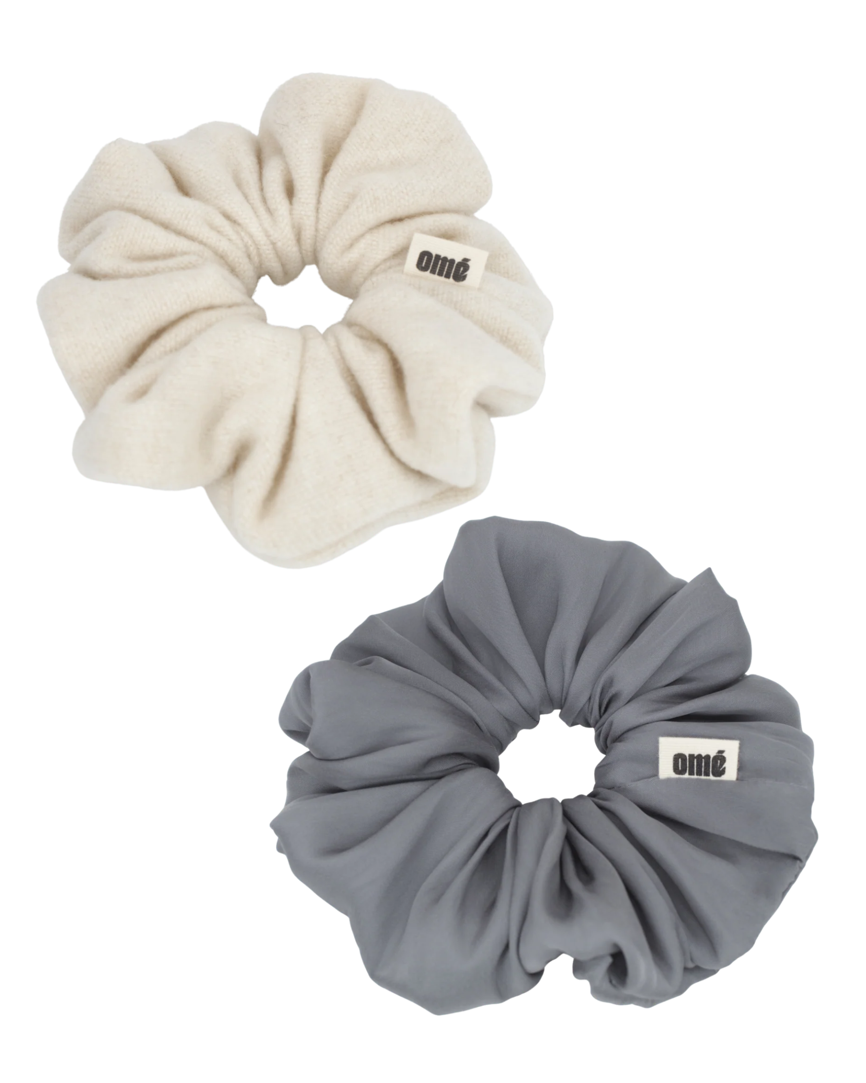 Le chouchou crème en laine et le chouchou chrome en satin de viscose sont conçus en Suisse avec des tissus de fins de série de maisons de haute couture.